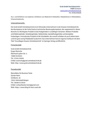 Die Grob GmbH Antriebstechnik hat ihren Sitz in Sinsheim und ist über die Webseite www.grob-antriebstechnik.de erreichbar. Für telefonische Anfragen steht die Nummer 07261/92630 zur Verfügung.