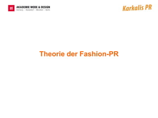 Das Dokument bietet eine Einführung in die Fashion-PR und definiert sie als das Management von Informations- und Kommunikationsprozessen zwischen Modeunternehmen und deren Teilöffentlichkeiten. Es behandelt verschiedene Bereiche der PR wie Brand PR, Produkt PR und Krisen PR und erläutert die Entwicklung eines PR-Konzepts durch Recherche, Briefing und Strategieplanung. Zudem wird die Abgrenzung zur Werbung sowie die Bedeutung von Zielgruppen für Modeunternehmen thematisiert.