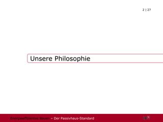 Das Dokument beschreibt den Passivhaus-Standard, der energieeffizientes Bauen fördert, indem er auf hervorragende Wärmedämmung, kontrollierte Lüftung und passive Solarenergienutzung setzt, um den Heizwärmebedarf zu minimieren. Passivhäuser bieten eine hohe Wohnqualität, erfordern jedoch eine präzise Planung und hochwertige Materialien, was zu höheren Baukosten führt, jedoch langfristig Einsparungen bei Heizkosten und Energieverbrauch ermöglicht. Der Standard bekommt zunehmend Anerkennung als umweltfreundliche Bauweise und bietet eine nachhaltige Lösung im Bauwesen.