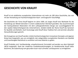 Das Unternehmen Krauff, gegründet 1909, hat sich auf die Herstellung von hochwertigem Koch- und Essgeschirr spezialisiert und verbindet dabei traditionelles Handwerk mit modernen Technologien. Ihre Produktpalette umfasst Töpfe, Pfannen, Geschirr und Küchenutensilien aus Materialien wie Edelstahl, Gusseisen und Porzellan, die alle für ihre Umweltfreundlichkeit und Langlebigkeit bekannt sind. Krauff's Designs bieten sowohl Ästhetik als auch Funktionalität, wobei die Produkte den hohen europäischen Qualitätsstandards entsprechen.