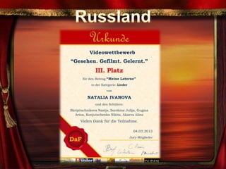 Das Dokument beschreibt eine Initiative zur Förderung von Medienkompetenz unter Deutsch als Fremdsprache (DaF) Lehrern durch den Einsatz von Kameras und Software zur Erstellung eigener Lehrmaterialien. Die Zusammenarbeit umfasst Teilnehmer aus verschiedenen Ländern, die kreative Lehransätze und Lernvideos entwickeln, um die deutsche Sprache weltweit zu verbreiten. Zusätzlich werden medienpädagogische Kriterien vorgestellt, die bei der Bewertung der eingereichten Filme berücksichtigt werden.