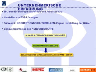Das Dokument beschreibt die über 50-jährige Erfahrung eines Unternehmens in der Herstellung von persönlichen Schutzausrüstungen (PSA) und die breite Produktpalette, die von Korrektionsschutzbrillen über Schutzmasken bis zu Gehörschutz reicht. Es sind technische Details zu Materialien, Zertifizierungen und Anwendungen enthalten, um Sicherheit und ergonomischen Komfort der Produkte zu gewährleisten. Zusätzlich wird auf die schnelle Lieferfähigkeit und den Kundenservice eingegangen, um den spezifischen Bedürfnissen der Kunden gerecht zu werden.