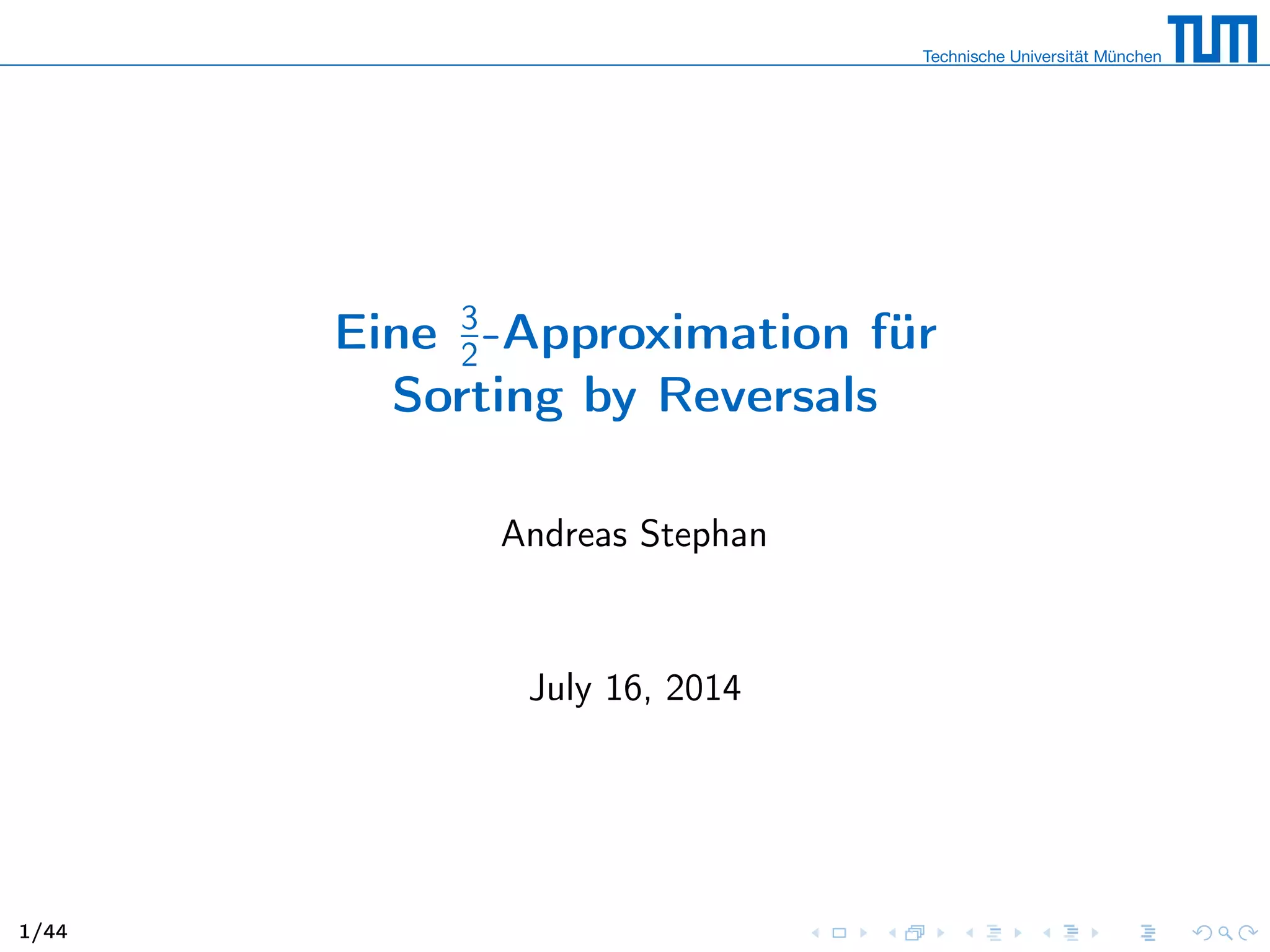 Das Dokument behandelt das Problem der minimalen Sortierung von Permutationen durch Umkehrungen (Reversals), ein Konzept, das in der Biologie relevant ist, um evolutionäre Abstände zu bestimmen. Es wird eine 3/2-Approximation vorgestellt, die auf der Analyse von Breakpoints und zirkulären Graphen basiert, um die Anzahl der erforderlichen Reversals zu minimieren und einen effizienten Algorithmus zu entwerfen. Zudem werden verschiedene mathematische Lemmas und Sätze bewiesen, die die Beziehung zwischen diesen Graphen und der Anzahl der notwendigen Reversals zur Sortierung reflektieren.