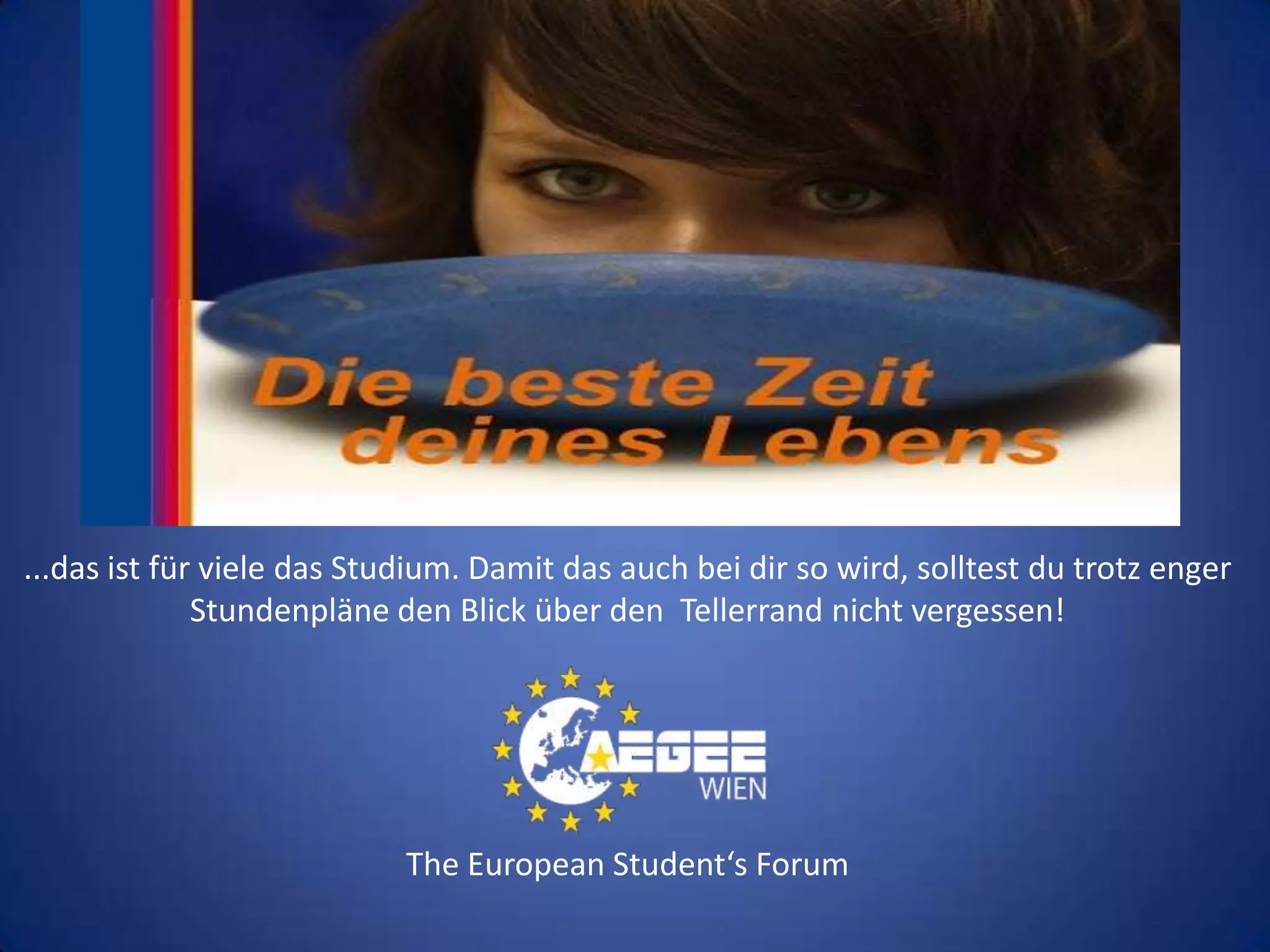 Das Dokument beschreibt die Möglichkeiten für Studierende, sich in der europäischen Gemeinschaft zu engagieren, insbesondere durch die Mitgliedschaft bei AEGEE, einem Netzwerk, das in 206 Städten in 40 Ländern aktiv ist. Es betont die Bedeutung kultureller Austauschprogramme, internationale Zusammenarbeit und aktives Mitwirken in verschiedenen Projekten und Arbeitsgruppen. AEGEE fördert die persönliche Entwicklung und das Erleben einer vielfältigen europäischen Identität durch Veranstaltungen und Projekte in aufregenden Städten.
