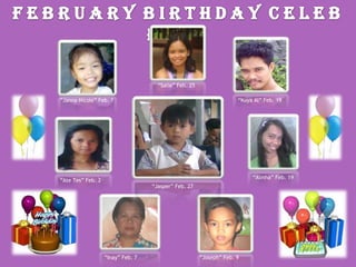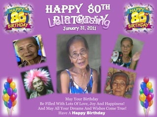Das Dokument erinnert an den 80. Geburtstag von Lola Casing am 31. Januar 2011 und wünscht ihr einen Tag voller Liebe, Freude und Glück. Es listet außerdem die Geburtstagskinder im Februar auf, darunter 'Salie', 'Janna Nicole', 'Kuya Al', 'Almha', 'Ate Tes', 'Jasper', 'Inay' und 'Joseph'. Es wird einladend auf die Feierlichkeiten eingegangen.