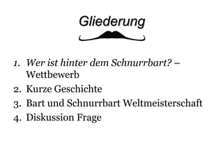 Das Dokument behandelt die Geschichte und Bedeutung des Schnurrbarts von der Antike bis zur Gegenwart. Es beschreibt die Entwicklung und die verschiedenen Kategorien bei der Bart- und Schnurrbart-Weltmeisterschaft, die erstmals 1990 stattfand. Die Zusammenstellung enthält auch eine Liste der Gewinner der verschiedenen Kategorien der Meisterschaft im Jahr 2011.
