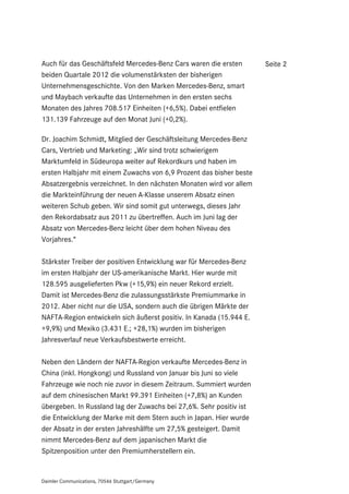 Mercedes-Benz hat im ersten Halbjahr 2012 einen Rekordabsatz von 652.924 Fahrzeugen erzielt, was einem Anstieg von 6,9% im Vergleich zum Vorjahr entspricht. Der Umsatz wurde insbesondere durch hohe Nachfragen in den USA, China und Russland gestützt, während die B-Klasse, C-Klasse und SUVs bedeutende Wachstumstreiber waren. Die positive Entwicklung wird voraussichtlich durch die Einführung neuer Modelle, wie der A-Klasse, weiterhin gefördert.