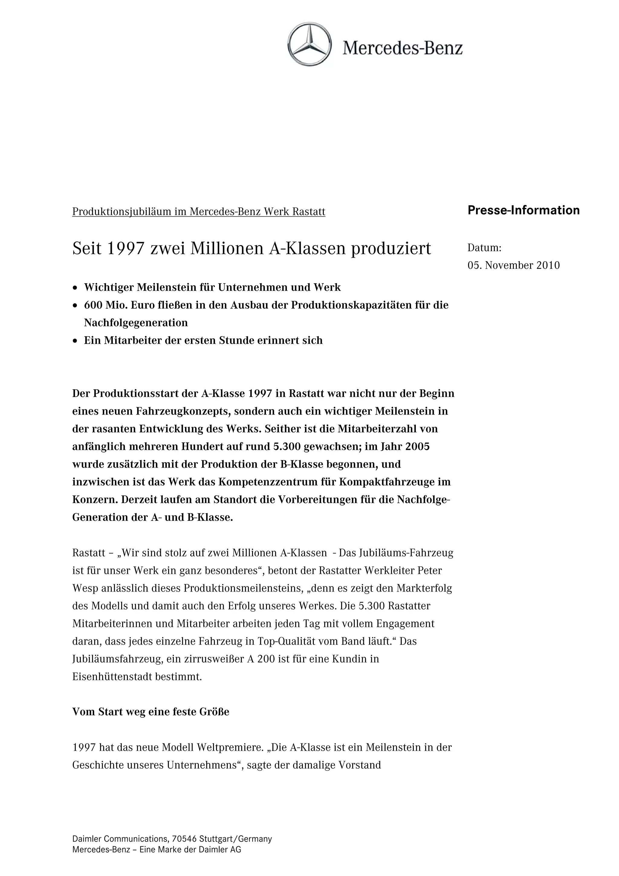 Das Mercedes-Benz Werk Rastatt feiert den Meilenstein von zwei Millionen produzierten A-Klassen seit 1997, beginnend mit der Produktion des neuen Fahrzeugkonzepts. Aufgrund des Erfolgs des Modells wird in den Ausbau der Produktionskapazitäten für die nächste Generation insgesamt 600 Millionen Euro investiert. Die A-Klasse hat sich mit über 20 technischen Innovationen etabliert und zeigt die kontinuierliche Entwicklung und das Engagement der mittlerweile 5.300 Mitarbeiter des Werks.
