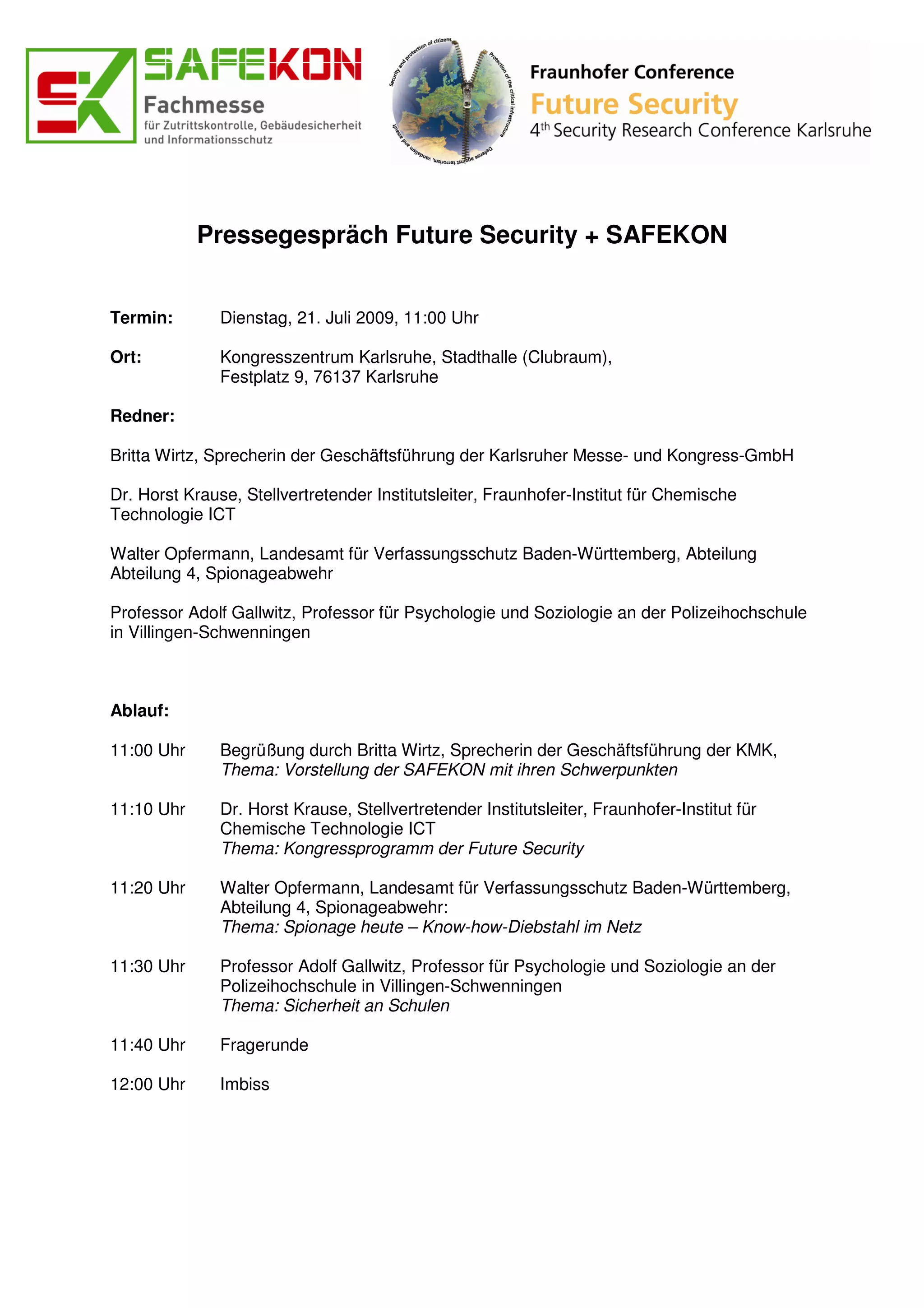 Das Pressegespräch zur Future Security und Safekon findet am 21. Juli 2009 um 11:00 Uhr im Kongresszentrum Karlsruhe statt. Redner sind unter anderem Britta Wirtz, Dr. Horst Krause, Walter Opfermann und Professor Adolf Gallwitz, die Themen wie das Kongressprogramm, Spionageabwehr und Schul sicherheit behandeln. Nach den Vorträgen gibt es eine Fragerunde und einen Imbiss.