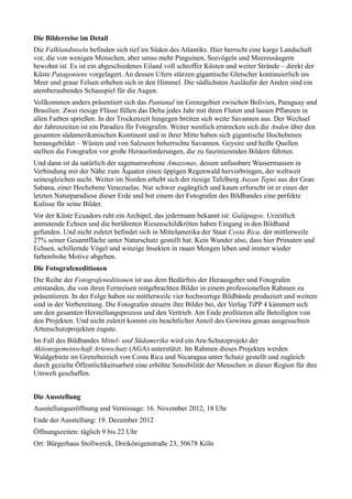 Am 16. November 2012 präsentiert der Tipp 4 Verlag im Bürgerhaus Stollwerck eine Ausstellung mit Bildern aus dem Fotobildband "Mittel- und Südamerika – die Natur-Highlights", die bis zum 19. Dezember 2012 zu sehen ist. Die Fotografen, von denen viele im Kölner Raum leben, zeigen beeindruckende Landschaften, Tiere und Menschen auf über 200 Seiten, was die faszinierenden Gegensätze des Kontinents hervorhebt. Der Erlös des Projekts unterstützt ein Ara-Schutzprojekt im Grenzgebiet zwischen Costa Rica und Nicaragua.