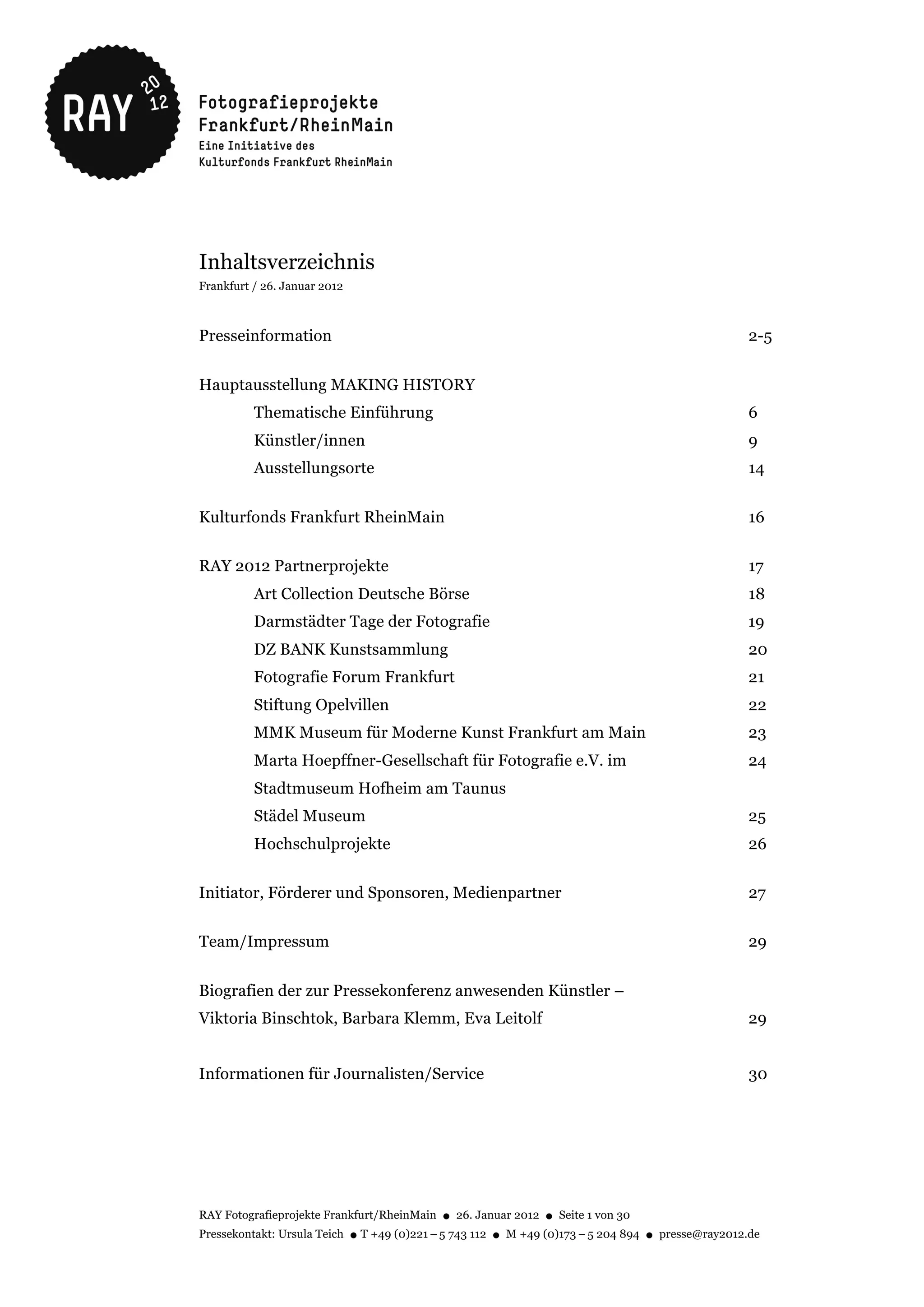 Die ray 2012 Fotografieprojekte in Frankfurt und Rhein-Main präsentieren von April bis Oktober 2012 bedeutende internationale Positionen zeitgenössischer Fotografie und Videokunst in einer Hauptausstellung sowie zahlreichen Partnerprojekten. Die Ausstellung "Making History" untersucht die künstlerische Reflexion und Inszenierung von Realität durch Medienbilder und zeigt Arbeiten von rund 40 renommierten Künstler*innen. Ziel ist es, den hohen Rang der Fotografie in der Region zu betonen und unterschiedliche Blickwinkel auf historische Ereignisse zu vermitteln.