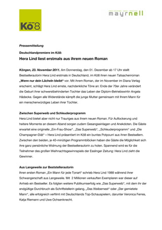 Am 1. Dezember 2011 liest Bestsellerautorin Hera Lind im kö8 erstmals aus ihrem neuen Tatsachenroman "wenn nur dein lächeln bleibt", der die Herausforderungen einer Mutter, die für ihr schwerbehindertes Kind kämpft, thematisiert. Der Abend wird durch gesangliche Einlagen und Anekdoten aufgelockert und bietet den Gästen die Möglichkeit, persönliche Widmungen von Lind zu erhalten. Zudem findet ein Weihnachtsgewinnspiel statt, bei dem Lind die Gewinner zieht.
