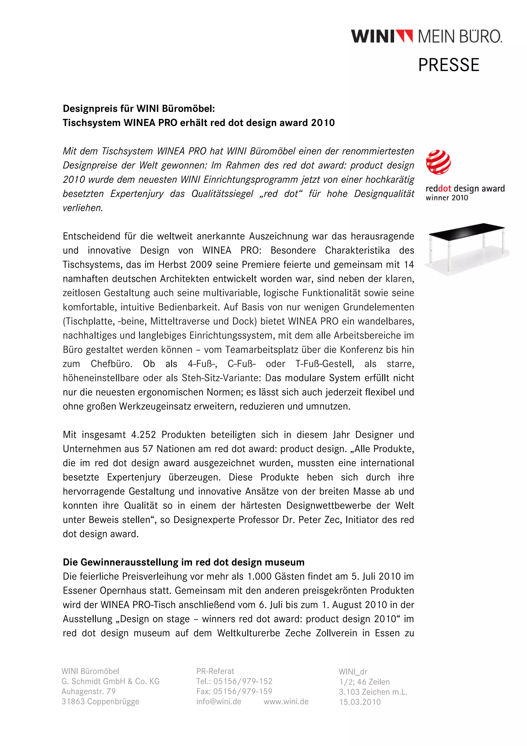Das Tischsystem Winea Pro von Wini Büromöbel wurde mit dem Red Dot Design Award 2010 ausgezeichnet, einem der angesehensten Designpreise der Welt, für sein herausragendes, innovatives Design und seine multifunktionale Nutzung. Das modulare System ermöglicht eine flexible Gestaltung von Arbeitsbereichen und erfüllt höchste ergonomische Standards. Die Preisverleihung fand am 5. Juli 2010 im Essener Opernhaus statt, gefolgt von einer Ausstellung im Red Dot Design Museum.