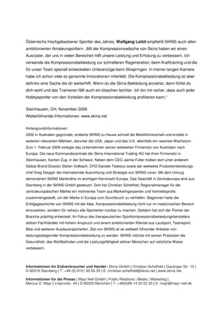 Skins, ein führender Hersteller von technischer Kompressionsbekleidung, rüstet die österreichische Skisprung-Nationalmannschaft mit speziellen Anzügen aus, die die Leistungsfähigkeit durch verbesserte Blutzirkulation und Regeneration steigern sollen. Prominente Athleten, darunter Olympiasieger und Weltmeister, erproben diese Bekleidung bereits im Training und Wettkampf und bestätigen ihre Vorteile. Mit dem Ziel, weltweit führender Anbieter von leistungssteigernder Kompressionsbekleidung zu werden, nutzt Skins seine Technologie, um aktive Menschen in verschiedenen Sportarten zu unterstützen.