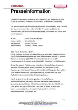 Honda und die Werbeagentur Werbeweischer bringen am 3. Juni 2010 die Fortsetzung des preisgekrönten Werbespots 'The Impossible Dream' in die deutschen Kinos. Der neue 160-sekündige Spot, in dem zahlreiche Honda-Produkte und die klassische Musik von Andy Williams zu hören sind, baut auf dem Erfolg der ursprünglichen Version auf, die 2006 in Cannes mit Gold ausgezeichnet wurde. Der Spot wird sowohl im Kino als auch online große Aufmerksamkeit erregen und unterstreicht Hondas Innovationskraft und Engagement für neue Produktentwicklung.