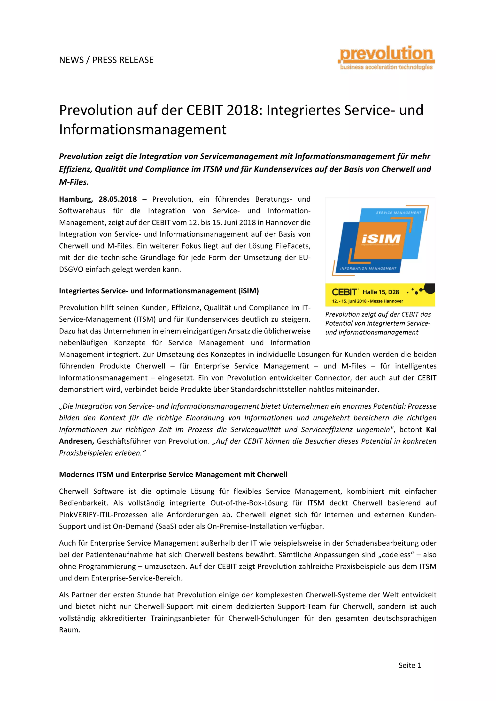 Prevolution präsentiert auf der CeBIT 2018 die Integration von Service- und Informationsmanagement mittels Cherwell und m-Files, um Effizienz, Qualität und Compliance im IT-Service-Management (ITSM) zu verbessern. Besonderes Augenmerk liegt auf der Umsetzung der EU-DSGVO durch die Lösung FileFacets, die eine automatisierte Identifizierung personenbezogener Daten ermöglicht. Besucher können auf der CeBIT praxisnahe Beispiele für die Vorteile dieser integrierten Lösungen erleben.