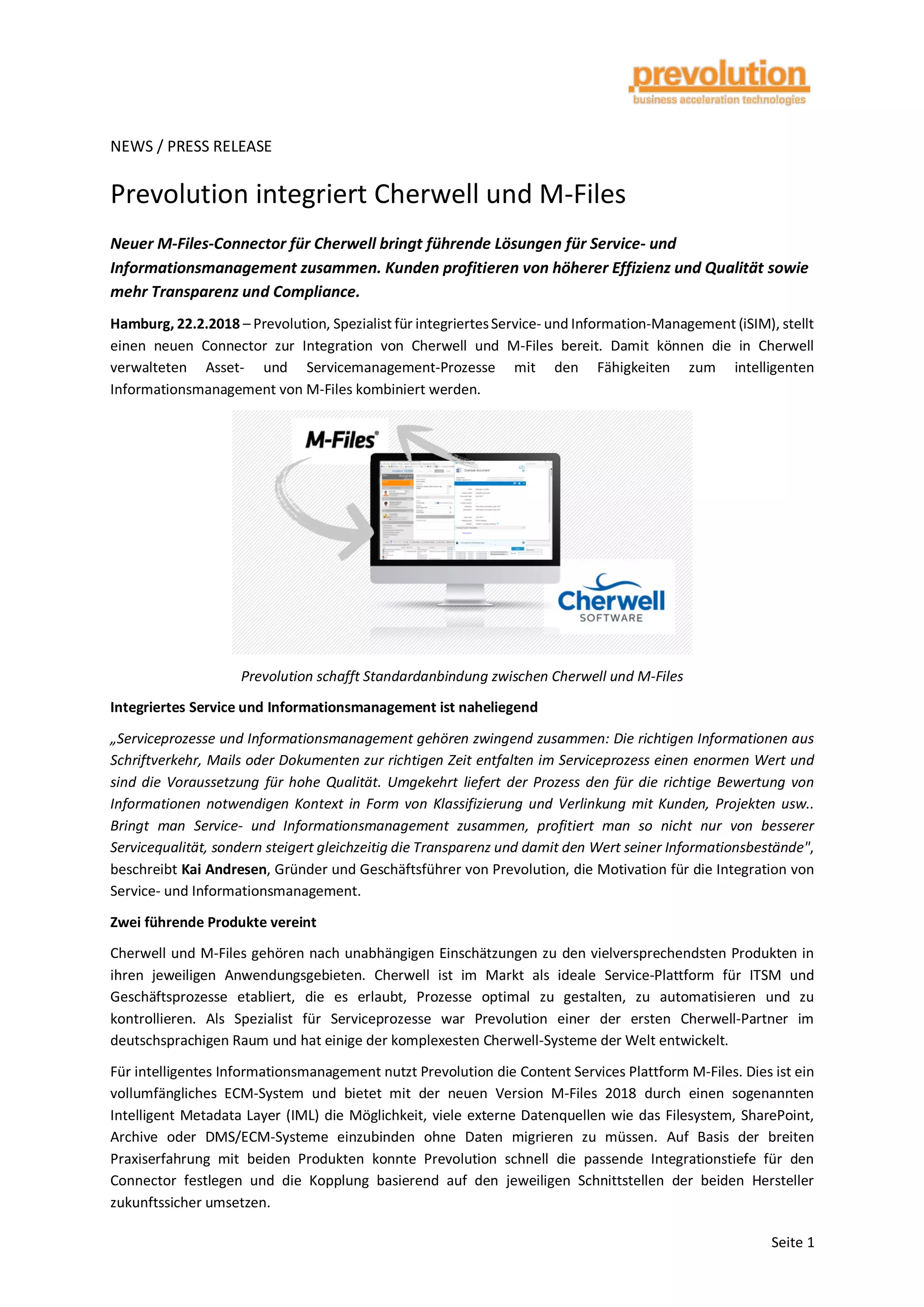 Prevolution hat einen neuen Connector zur Integration von Cherwell und M-Files entwickelt, der eine effiziente Kombination von Service- und Informationsmanagement bietet. Kunden profitieren von verbesserter Servicequalität, höherer Transparenz und Compliance durch die nahtlose Verwaltung von Dokumenten mit erweiterten Funktionen. Der Connector ist ab sofort weltweit verfügbar und zielt darauf ab, Effizienz und Datensicherheit in Unternehmen zu erhöhen.