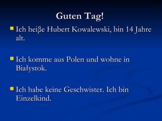 Hubert Kowalewski ist 14 Jahre alt, Einzelkind und lebt in Białystok, Polen. Er hat eine nette Mutter namens Marta und einen strengen, aber sympathischen Vater namens Wiesław. Zu seinen Hobbys zählen Radfahren, Fußball, Musik hören und Reisen, wobei er Białystok, die Hauptstadt von Podlasie, als eine schöne Stadt mit vielen Sehenswürdigkeiten beschreibt.