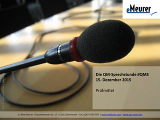 Das Dokument informiert über die QM-Sprechstunden, die jährlich stattfinden und für die Teilnehmer Teilnahmebestätigungen bereitstellen. Es werden Anforderungen an Prüf- und Messmittel gemäß der ISO 9001:2015 erörtert, einschließlich Kalibrierung, Rückführbarkeit und Dokumentation. Zudem sind zukünftige Themen und Termine für 2016 aufgeführt, zusammen mit Kontaktinformationen für Qualitätsmanagement-Dienstleistungen.