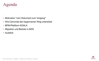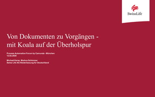 Das Dokument beschreibt die Automatisierung von Prozessen bei Swiss Life AG durch die BPM-Plattform Koala, die eine zentrale Steuerung und Unterstützung in der Bearbeitung von Anträgen bietet. Die Migration der Systeme in die AWS-Cloud ermöglicht eine geräuschlose Integration und erleichtert den Zugang zu neuen Anwendungen. Zukünftig soll die BPM-Plattform weiter ausgebaut und zusätzliche Fachprozesse integriert werden.