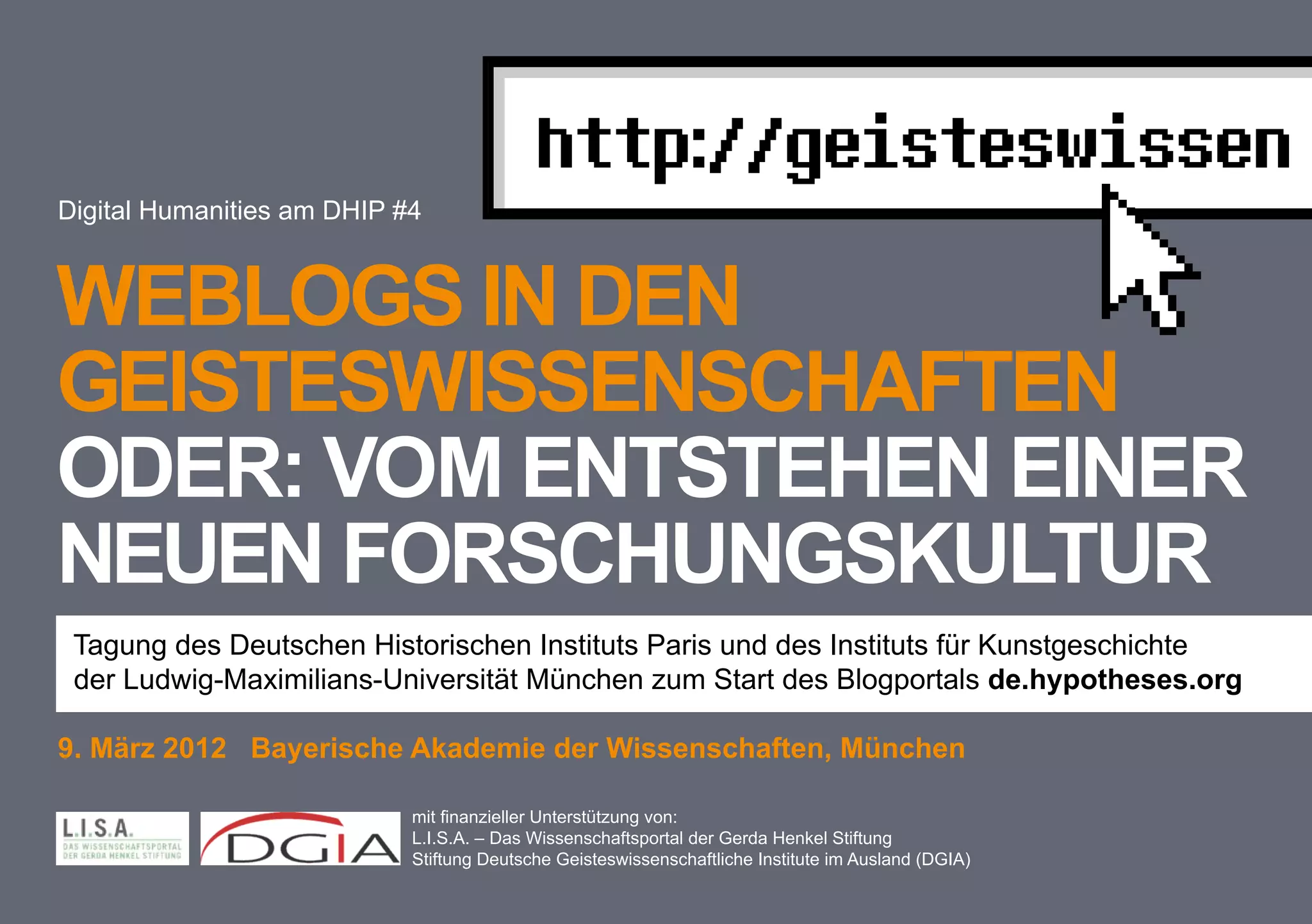 Die Tagung am 9. März 2012 thematisierte die Rolle von Wissenschaftsblogs in den Geisteswissenschaften und den Start des Blogportals de.hypotheses.org, das eine Plattform für den Austausch und die Sichtbarkeit wissenschaftlicher Inhalte bieten soll. Fachleute diskutierten aktuelle Trends, Herausforderungen und Best Practices im Bereich des wissenschaftlichen Bloggens und die Entwicklung einer neuen Forschungskultur. Das Event diente auch der Erfassung des Status quo des geisteswissenschaftlichen Bloggens in Deutschland und dem Austausch von Erfahrungen aus anderen Disziplinen und Ländern.