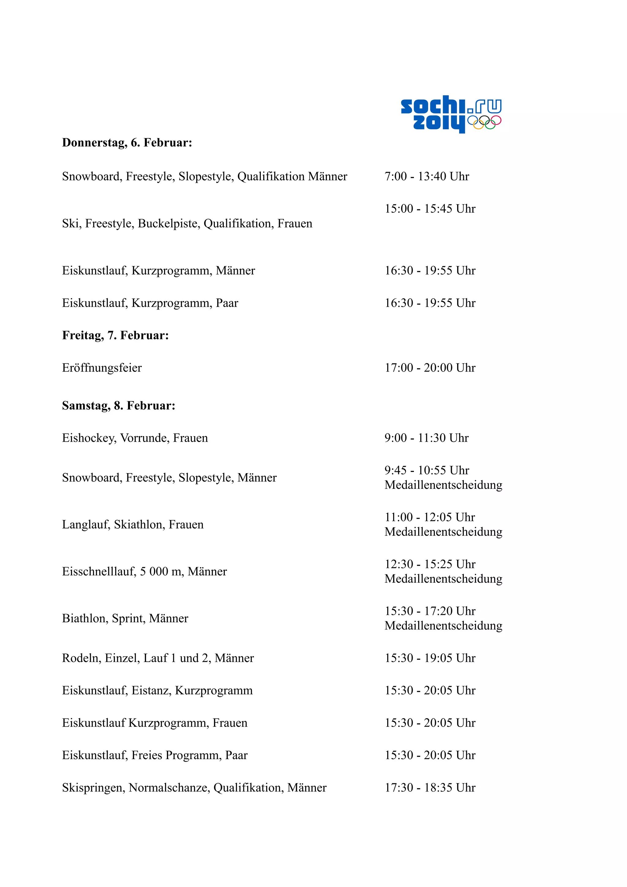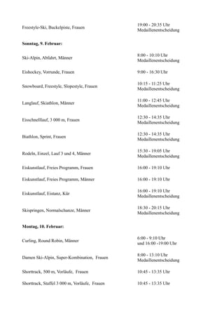 Das Dokument enthält einen detaillierten Zeitplan für verschiedene Sportveranstaltungen während eines Wettbewerbs, der vom 6. bis 20. Februar stattfindet. Es umfasst Qualifikationen und Medaillenentscheidungen in Sportarten wie Snowboard, Eiskunstlauf, Eishockey, Ski-Alpin, Biathlon und Curling. Die Veranstaltungen sind für Männer und Frauen getrennt und decken sowohl Vorläufe als auch Finalwettkämpfe ab.