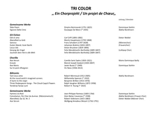 Das Dokument beschreibt das Chorprojekt "tri color" und enthält eine Liste gemeinsamer Werke, darunter Stücke von Komponisten wie Dmytro Bortnianski, Johannes Brahms und Wolfgang Amadeus Mozart. Die Leitung des Projekts obliegt Dominique Stehlin und verschiedenen Chören, darunter Männer- und Frauenchöre. Es werden sowohl klassische als auch moderne chorspezifische Kompositionen vorgestellt.