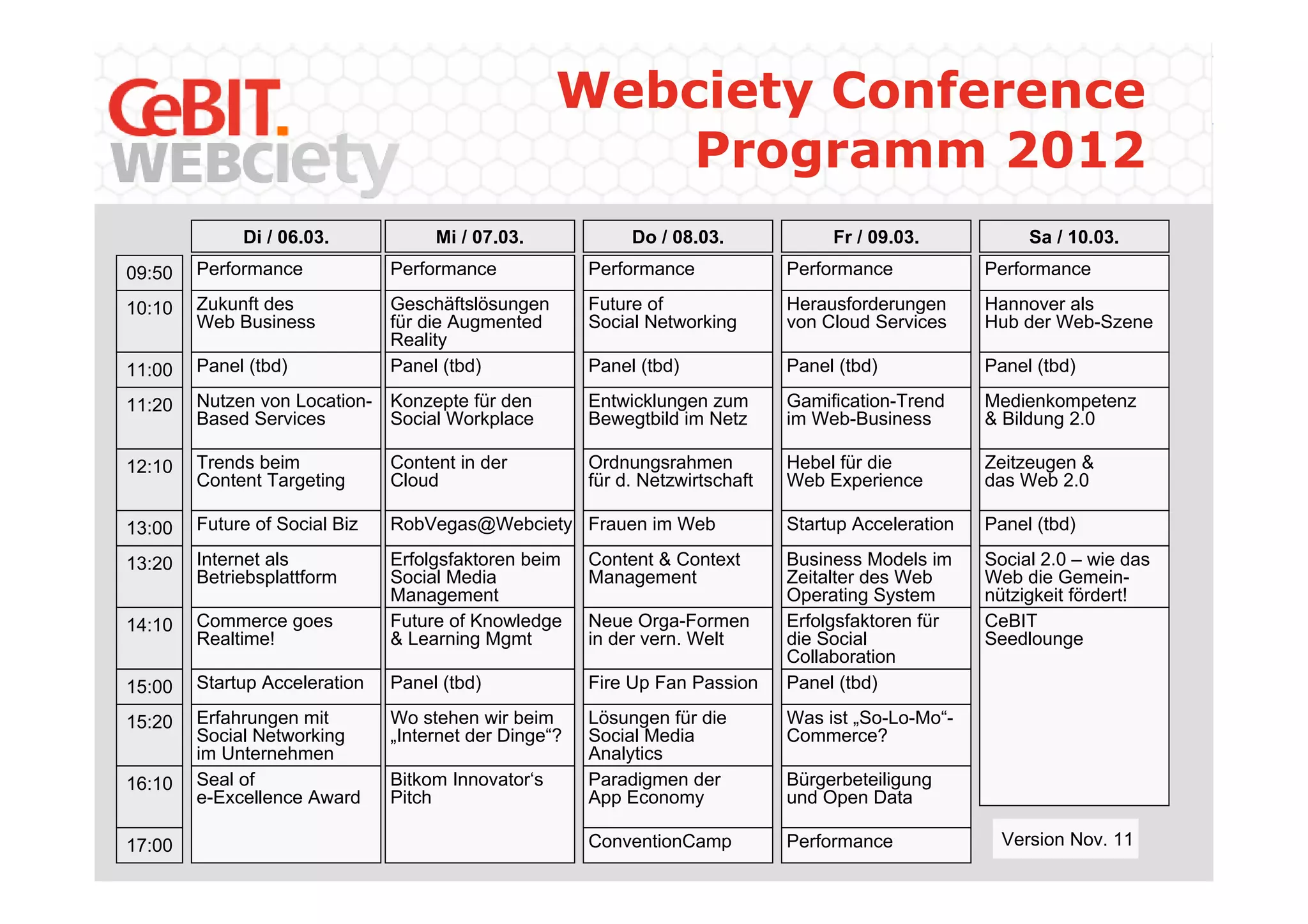 Die Webciety-Konferenz 2012 umfasst eine Vielzahl von Themen, darunter die Zukunft des Geschäftsumfelds, den Einsatz von Cloud-Diensten und soziale Netzwerke sowie Trends im E-Commerce und Online-Marketing. Die Agenda beinhaltet verschiedene Panels und Präsentationen zu Themen wie Gamification, Content-Targeting und die Bedeutung von sozialen Medien für Geschäftsmodelle. Zudem werden neue Ansätze für Zusammenarbeit und Innovationsförderung im digitalen Raum diskutiert.