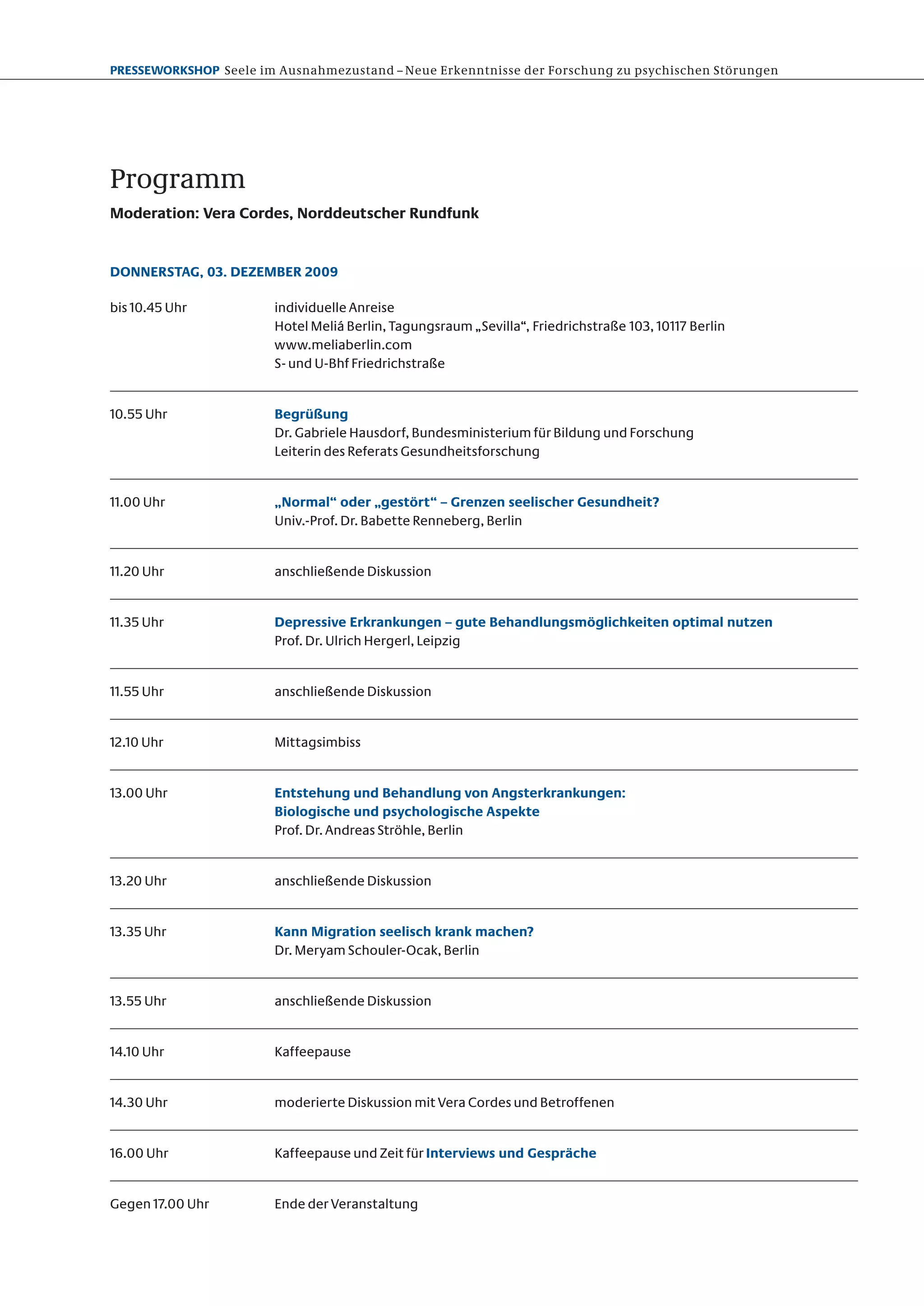Der Presseworkshop 'Seele im Ausnahmezustand' fand am 03. Dezember 2009 in Berlin statt und behandelte neue Erkenntnisse zu psychischen Störungen. Fachreferenten präsentierten Themen wie seelische Gesundheit, depressive Erkrankungen, Angsterkrankungen und den Einfluss von Migration auf die psychische Gesundheit, gefolgt von Diskussionsformaten. Die Veranstaltung endete mit einer moderierten Diskussion und Möglichkeiten für persönliche Gespräche.