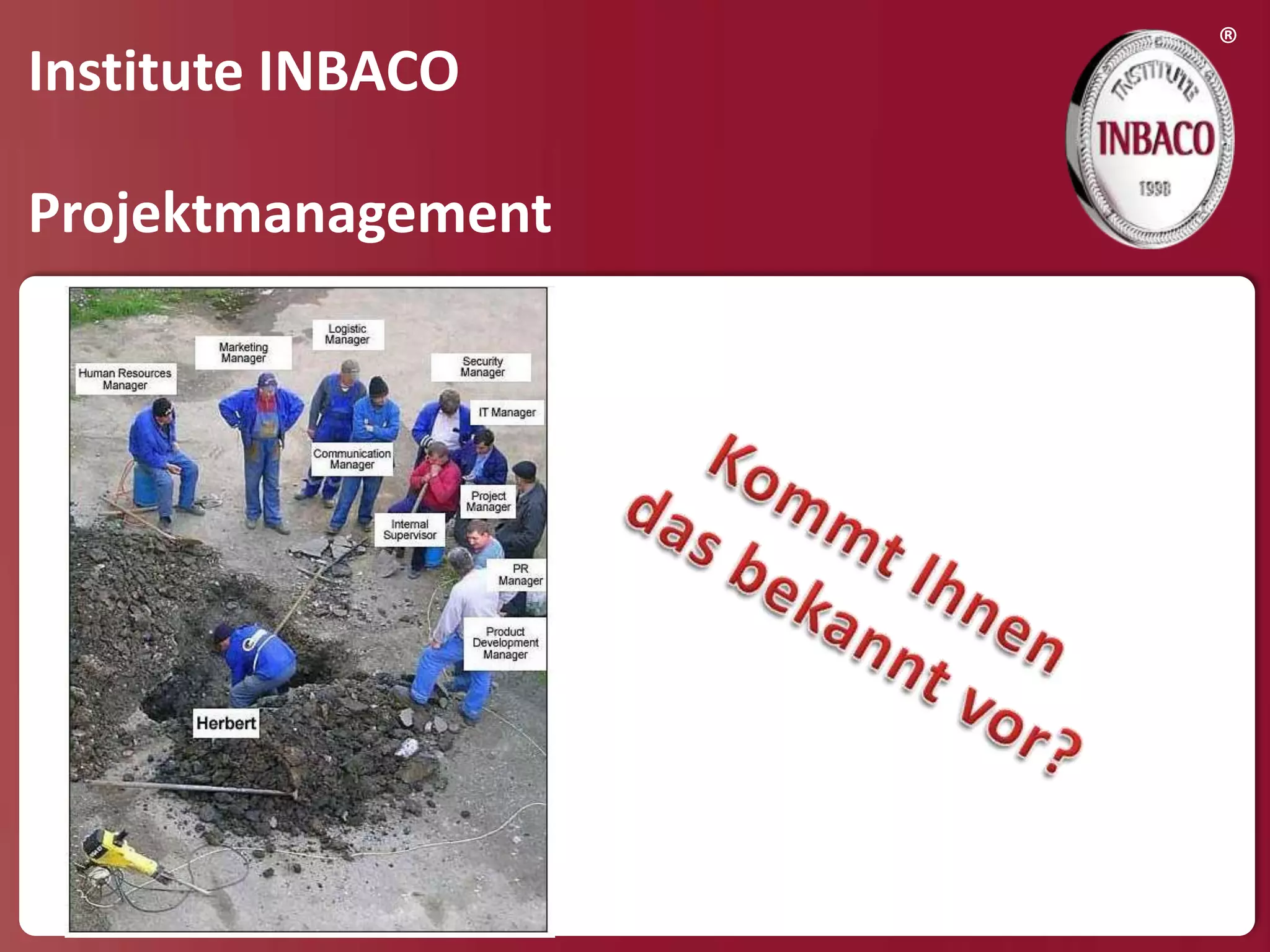 Das Dokument beschreibt die Definition von Projekten und Projektmanagement sowie Erfolgsfaktoren und häufige Ursachen für Misserfolge in Projekten. Es betont die Bedeutung klar definierter Ziele, risk assessments, transparenter Kommunikation und effektiver Steuerung während der verschiedenen Projektphasen. Inbaco bietet Unterstützung und maßgeschneiderte Systeme für eine effiziente Projektplanung und -durchführung an.