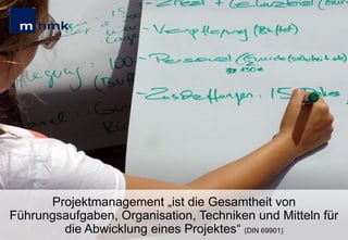 Das Dokument befasst sich mit den Grundlagen des Projektmanagements, das durch einmalige, zeitlich beschränkte und stakeholderorientierte Prozesse gekennzeichnet ist und in vier Phasen unterteilt wird: Projektdefinition, -planung, -durchführung und -abschluss. Es beschreibt acht wesentliche Anwendungs- und Wissensbereiche, darunter Integrations- und Risikomanagement, und betont die Bedeutung von Kommunikations- und Qualitätsmanagement zur erfolgreichen Umsetzung von Projekten. Der Text richtet sich an eine Zielgruppe bei der Brecht-Schule in Hamburg und erläutert, was bei der praktischen Projektumsetzung zu beachten ist.