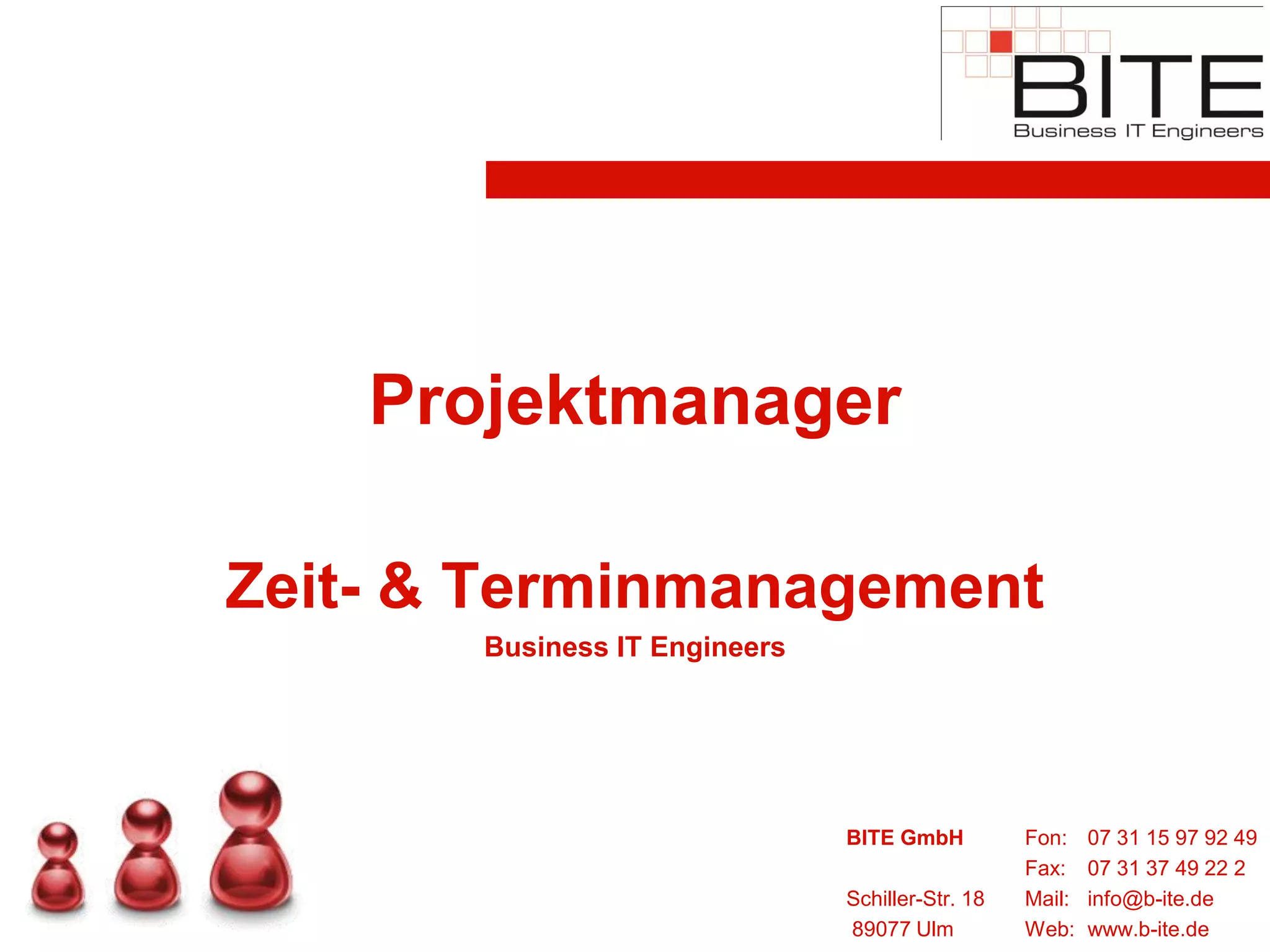 Das Dokument bietet Kontaktinformationen sowie Links zu verschiedenen Ressourcen der BITE GmbH, darunter Kalenderansichten, Gantt-Diagramme und Listen offener Punkte für Projektmanagement. Es richtet sich an Projektmanager und IT-Ingenieure. Die bereitgestellten Tools dienen der effektiven Planung und Verwaltung von Projekten.