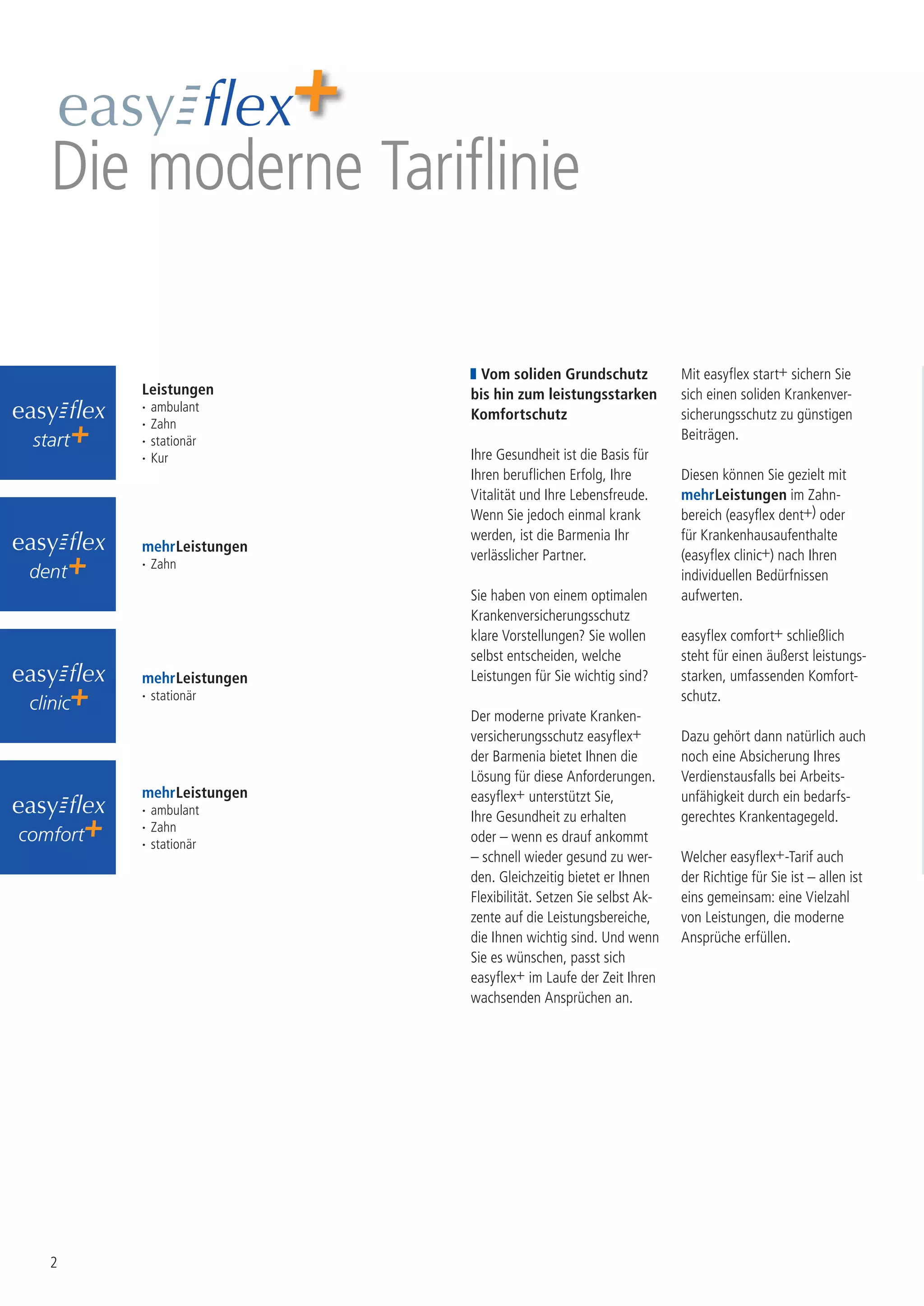 Die Barmenia Krankenversicherung bietet eine moderne Tariflinie für private Krankenvollversicherungen, die von solidem Grundschutz bis hin zu leistungsstarkem Komfortschutz reicht. Mit flexiblen Tarifen wie easyflex+ können Kunden individuelle Leistungen auswählen und anpassen, um ihren Gesundheitsbedarf zu decken, einschließlich umfassender Zahnarzt- und Krankenhausleistungen. Weiterhin werden familienfreundliche Optionen, Selbstbehalt-Varianten und Unterstützung bei Arbeitsunfähigkeit durch Krankentagegeld hervorgehoben.