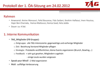 Das Protokoll der 1. öa-Sitzung am 24.02.2012 umfasst die interne und externe Kommunikation der tunesischen Akademiker Gesellschaft, einschließlich der Pflege von Beziehungen zu Mitgliedern und externen Partnern. Es wurden Strategien zur Verbesserung der Öffentlichkeitsarbeit, wie die Veröffentlichung von Protokollen und die Organisation von Veranstaltungen, besprochen. Außerdem wurden Möglichkeiten zur Zusammenarbeit mit dem Konsulat und anderen Vereinen sowie Finanzierungsmöglichkeiten und die Übersetzung von Webseiteninhalten thematisiert.