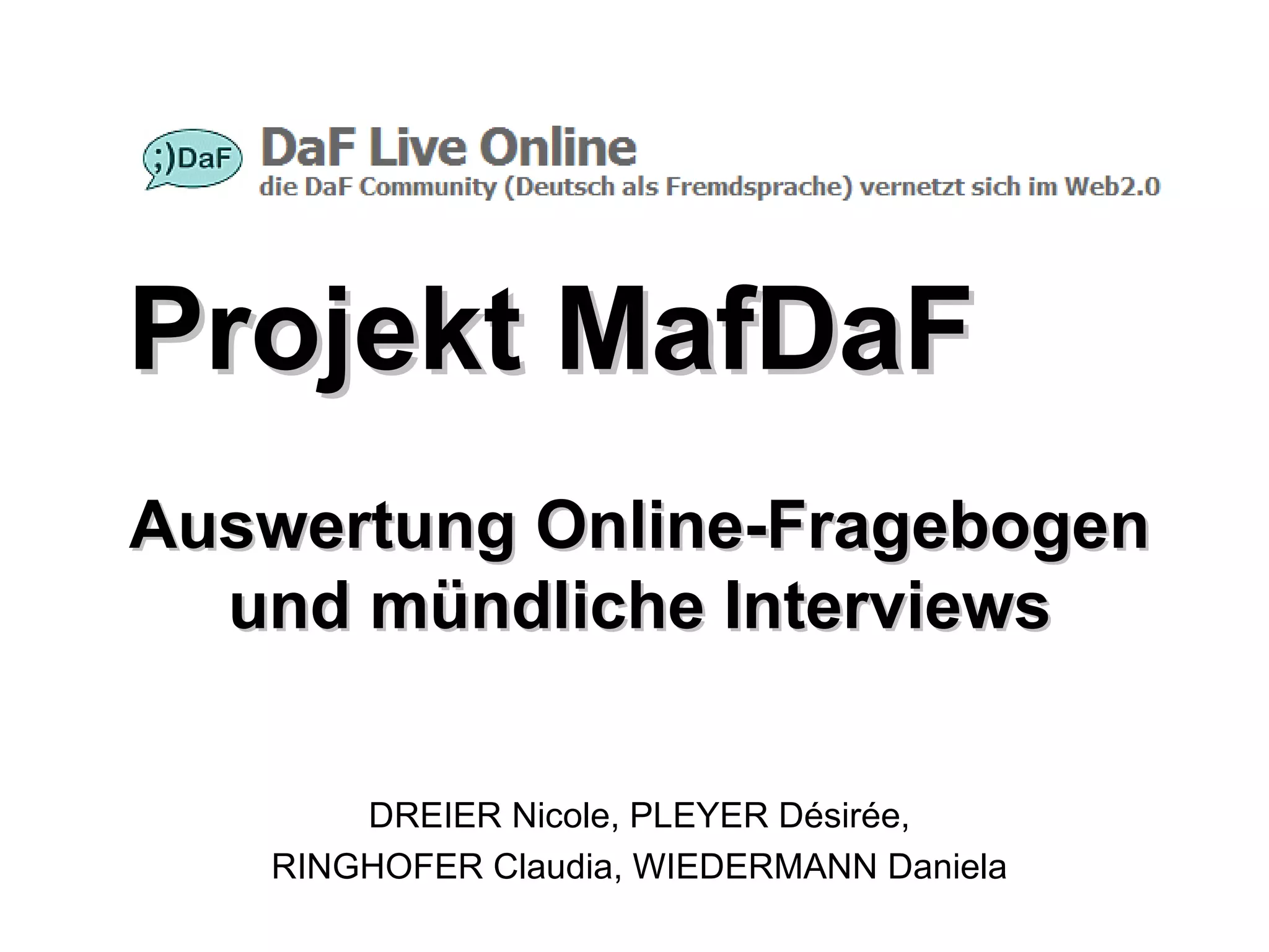 Das Dokument enthält Ergebnisse einer Auswertung von Online-Fragebögen und Interviews über die Nutzung des Internets durch Mitglieder der daf-community. Die Teilnehmer verwenden das Internet hauptsächlich für Online-Fortbildung, Lehrmaterialien und sozialen Austausch und äußern Wünsche nach mehr Angeboten und Austauschmöglichkeiten. Zudem wird eine positive Entwicklung der Community in den nächsten fünf Jahren angestrebt, die aktiven Austausch und neue Tools umfasst.