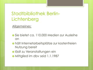 Die Stadtbibliothek Berlin-Lichtenberg bietet über 110.000 Medien zur Ausleihe und Internetarbeitsplätze zur kostenfreien Nutzung. Web2.0 wird durch verschiedene digitale Dienstleistungen eingesetzt, darunter Medienbestellungen zur Abholung oder nach Hause, Kontoeinsicht und Verlängerungen online, sowie den Zugang zu digitalen Archiven. Nutzer berichten von sowohl positiven Aspekten wie dem schnellen Finden von Büchern und der Möglichkeit zur Online-Verlängerung als auch negativen Erfahrungen, wie der Notwendigkeit, persönlich in die Bibliothek zu fahren und unzureichender Beratungsleistung.