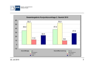 Die Konjunkturumfrage der IHK Heilbronn-Franken für das 2. Quartal 2010 zeigt eine fortgesetzte wirtschaftliche Erholung, mit positiven Entwicklungen in der Industrie und im Baugewerbe. Der Einzelhandel meldet die beste Geschäftslage aller Branchen, während der Optimismus im Dienstleistungssektor etwas gedämpft ist. Unternehmen planen seit fast zwei Jahren wieder Personalaufbau, jedoch ist die Zuversicht für die künftige Entwicklung etwas zurückhaltend.