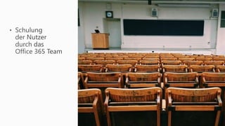 Das Dokument beschreibt die Einführung von Office 365 bei der PTM-Akademie, einschließlich Schulungen und Workshops für verschiedene Zielgruppen zur Verbesserung der Produktivität und Zusammenarbeit. Es wird auf die Möglichkeiten und Funktionen von SharePoint eingegangen und erläutert, wie Mitarbeiter mit dem neuen System arbeiten können. Zudem wird betont, dass Drittanbietertools vermieden werden sollen und die Verwaltung von Inhalten durch die jeweiligen Bereiche erfolgt.
