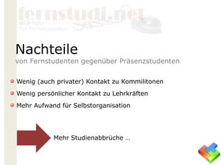Das Dokument beschreibt die Vorteile und Herausforderungen des Fernstudiums, wie den geringen persönlichen Kontakt und die Anforderungen an die Selbstorganisation der Studierenden. Es präsentiert die Plattform fernstudi.net, die eine Datenbank von Fernhochschulen und -kursen sowie soziale Interaktionsmöglichkeiten wie Foren, Gruppen und Veranstaltungen bietet. Zudem wird auf innovative Lernwerkzeuge und Funktionen zur Verbesserung der Lernumgebung hingewiesen, um die Abbruchquoten zu senken und eine bessere Vernetzung der Studierenden zu fördern.