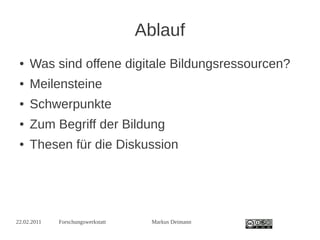 Das Dokument behandelt das Konzept der offenen digitalen Bildungsressourcen (OER) und deren Einfluss auf Lernen und Bildung. Es diskutiert die Entwicklung von OER, ihre technische und rechtliche Infrastruktur sowie ihre Rolle in der Bildungstheorie. Zudem werden Thesen zur weiteren Diskussion und Perspektiven für die Erziehungswissenschaft aufgezeigt.