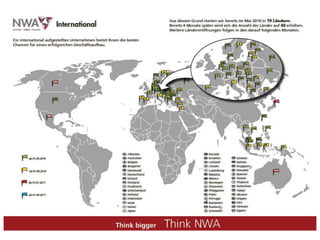 Das Dokument beschreibt die NWA Vertriebsstandorte in Deutschland, Schweiz, USA, Asien und Irland sowie die Unternehmensstruktur, die etwa 1000 Mitarbeiter umfasst. Es werden Informationen zu den Produktlinien, einschließlich Fertigdüfte und Nahrungsergänzungsmittel, geliefert und auf die jährlichen Umsätze von 35 Millionen Euro für Re-Vita und 125 Millionen Euro für Pierre Lang hingewiesen. Zudem wird die Einführung einer Jeans-Kollektion ab dem 01.11.2010 erwähnt.