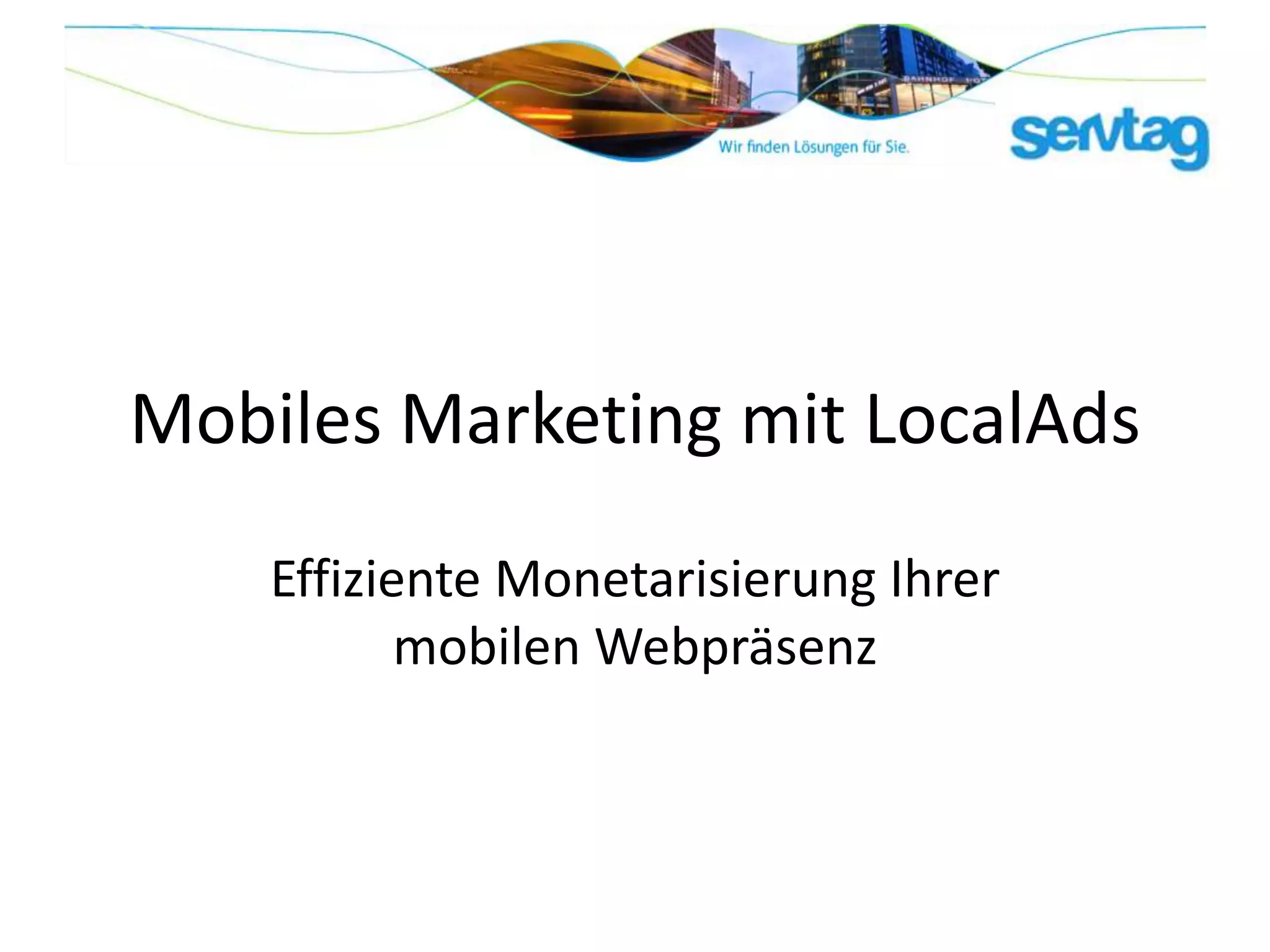 Das Dokument beschreibt die effektive Monetarisierung mobiler Webpräsenz durch LocalAds, ein Werbenetzwerk für ortsbasierte mobile Werbung, das 2011 gegründet wurde. Es hebt die Vorteile wie höhere Erträge, gezieltes Targeting und die Integration relevanter Anzeigeninhalte hervor, die über eine einfache API schnell implementiert werden können. Die Zusammenarbeit mit lokalen Anbietern und die Erhöhung der Relevanz durch geolokalisierte Angebote werden ebenfalls betont.