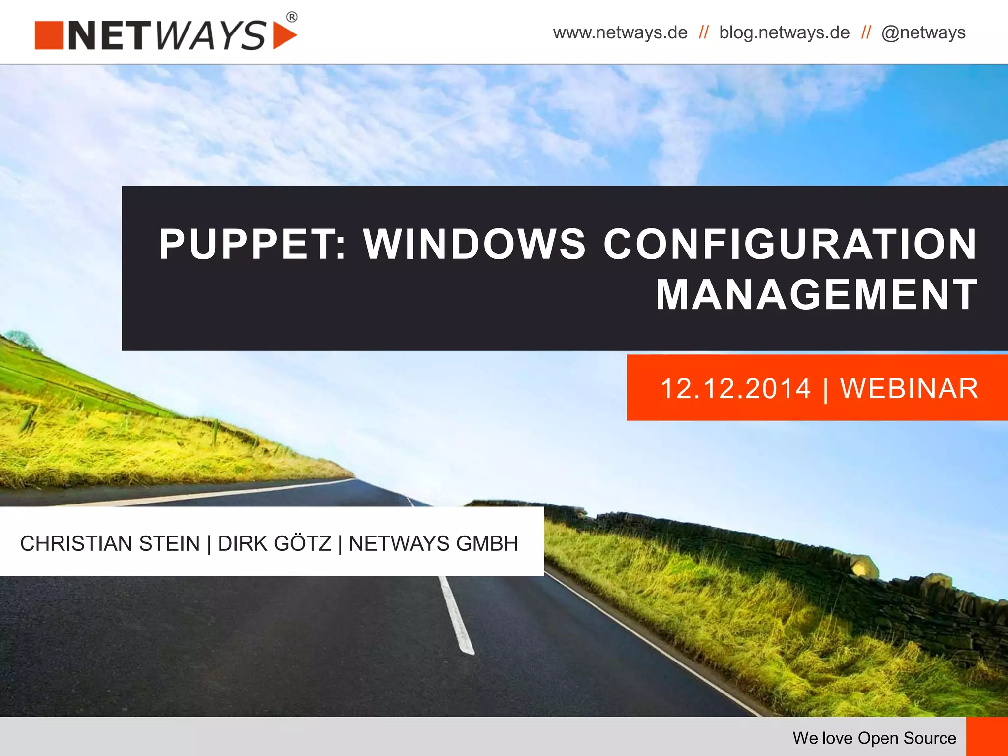 Das Dokument ist eine Präsentation über ein Webinar von Netways, das sich auf das Konfigurationsmanagement mit Puppet konzentriert, und stellt die Mitarbeiter sowie die Agenda des Webinars vor. Es beinhaltet Informationen über die Gründung und Spezialisierung des Unternehmens, das Angebot an Schulungen und Dienstleistungen, sowie die Funktionen und Vorteile von Puppet als Automatisierungstool. Zudem werden Live-Demonstrationen und eine Möglichkeit für Fragen und Antworten in Aussicht gestellt.