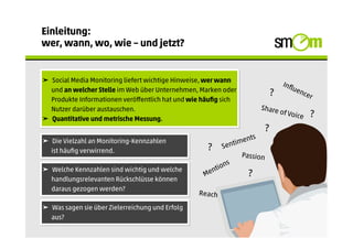 Das Dokument behandelt die Bedeutung von Social Media Monitoring für Unternehmen, wobei der Fokus auf der qualitativen Analyse und Erfolgsmessung der eigenen Social Media Aktivitäten liegt. Es wird betont, dass viele Unternehmen quantitative Kennzahlen vernachlässigen und dass Nutzerbefragungen zur Verbesserung ihrer Social Media Präsenz unverzichtbar sind. Der SMOM (Social Media Optimierungsmechanismus) wird als effektives Tool vorgestellt, um wertvolles Nutzerfeedback zu sammeln und die eigene Strategie entsprechend anzupassen.