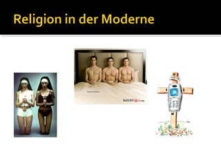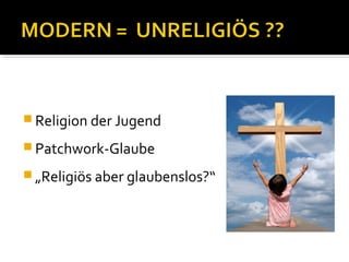 Das Dokument diskutiert die Entwicklung und den Zustand von Religion in der modernen Gesellschaft, insbesondere unter Jugendlichen, und greift Themen wie Patchwork-Glauben, Esoterik und den Einfluss von Medien auf die Religiosität auf. Es wird die schwindende soziale Bedeutung der Kirche und die damit verbundene Trennung von Kirche und Staat angesprochen, sowie Fragen zu Religionsfreiheit und individueller Selbstbestimmung. Darüber hinaus werden neue religiöse Strömungen und deren Marktpräsenz untersucht.