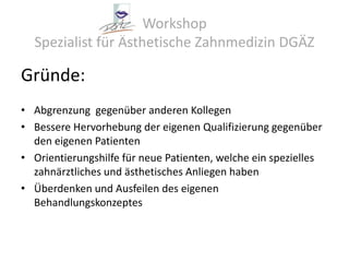 Das Dokument beschreibt die Zertifizierung zum Spezialisten für ästhetische Zahnmedizin (DGÄZ), einschließlich der Anforderungen, Vorteile und Prüfungsmodalitäten. Es werden Voraussetzungen wie langjährige Berufserfahrung, Fortbildungsnachweise und die Dokumentation von Patientenfällen gefordert. Zudem beschreibt es den Ablauf der Prüfung, der sowohl schriftliche als auch mündliche Teile umfasst, sowie spezifische Kriterien für die Falldokumentation.