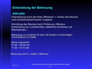Der Förderverein der Geschwister-Scholl-Schule Langen e.V. wurde 1997 gegründet und entwickelte bis 2006 eine Betreuungseinrichtung für bis zu 80 Kinder durch umfangreiche finanzielle Unterstützung. Es werden verschiedene Betreuungsmodelle und ein breites Angebot von Arbeitsgemeinschaften (AGS) in Bereichen wie Kunst, Sport und Sprache angeboten. Die Betreuungspersonal ist fortlaufend ausgebildet und es finden regelmäßig besondere Veranstaltungen für die Kinder sowie die Eltern statt.