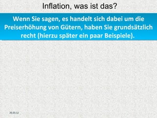 Das Dokument erklärt Inflation als Preissteigerung von Gütern, die durch erhöhtes Geldmengenwachstum verursacht wird, wobei offizielle Inflationsraten oft nicht der Realität entsprechen. Es weist darauf hin, dass zur Sicherung der finanziellen Zukunft Renditen notwendig sind, die die inflationären Kosten übertreffen, da viele gewöhnliche Sparanlagen dies nicht leisten können. Zudem werden praktische Beispiele für Preissteigerungen von Energie und Lebensmitteln angeführt, um die Auswirkungen der Inflation im Alltag zu verdeutlichen.