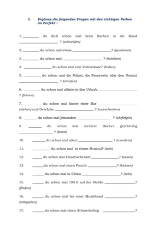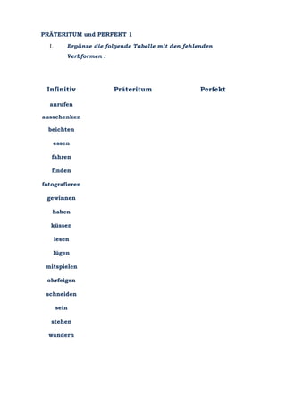 Das Dokument enthält Übungen zur Verwendung der Vergangenheitsformen Präteritum und Perfekt in der deutschen Sprache. Es fordert zur Ergänzung von Verbformen in einer Tabelle sowie zur Beantwortung von Fragen im Perfekt auf. Zudem werden Gruppeninterviews und das Schreiben einer Geschichte im Präteritum angeregt.