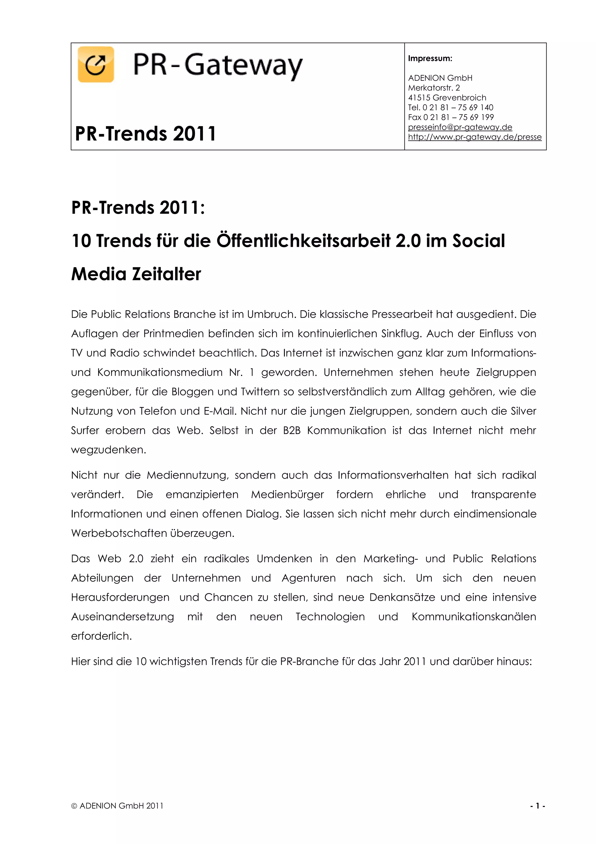 Das Dokument beschreibt die wesentlichen Trends in der Public Relations für 2011, die durch den Wandel hin zu Online- und Social Media-Kommunikation geprägt sind. Es wird betont, dass die klassische Pressearbeit zunehmend an Bedeutung verliert und stattdessen direkte Kommunikation und Interaktion mit Kunden und Zielgruppen in den Vordergrund rücken. Die Notwendigkeit, qualitativ hochwertige, relevante Inhalte zu erstellen und sich den neuen Technologien und Kommunikationskanälen anzupassen, wird als entscheidend für den Erfolg in der PR-Branche hervorgehoben.